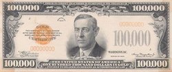 1934年發行的100,000美元(金幣券)正面大面額美元紙幣的設計圖案經過多次改變,自1928年之後,其尺寸與1至100美元的紙幣大小相同,設計也相似,正面為總統和政治家頭像,背面為面額和花紋卷渦紋飾。