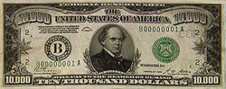 自1861年起,美國政府開始印刷面額超過100美元的紙幣,當時發行的大額紙幣面額有500元、1000元和5000元。1865年發行了面額為10000美元的紙幣。面額為100000美元的紙幣從未投入流通,只是作為聯邦儲備銀行之間的結算券。