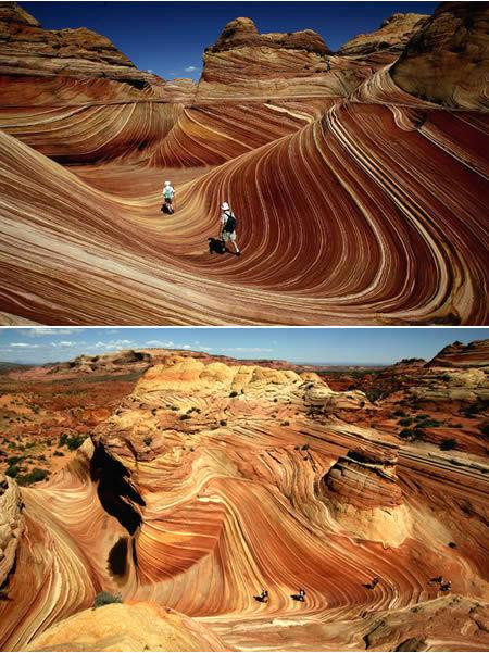 一、美國猶他州和亞利桑那州交界處的神秘「石浪」。位於猶他州和亞利桑那州交界處的神秘「石浪」是由1.9億年前的沙丘演變而成。在不到200平方米的山間縫隙中,血紅的砂岩如海浪翻騰,剛和柔的奇妙結合令人歎為觀止。順著砂岩的紋路觸摸著精緻的波浪痕跡,彷彿還可以感受到億萬年前沙暴的精心設計和雕刻。