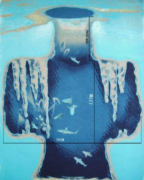 距洪都拉斯伯利茲市60英里的海域有一處叫做「藍洞」的水下坑洞,這個大洞直徑為1000多英尺,洞內水深480英尺,是冰河時代末期形成的一個石灰石坑洞。在某些靜謐的近海洋面上,會突然出現一汪深藍色的圓形水域,從高空看,彷彿是大海的瞳孔,從莫名深處的望過來,深邃、神秘、詭異,這種現象被人們稱為藍洞。全世界海洋中分佈有許多大小不同形態各異的藍洞,其中最著名的,便是位於中美洲洪都拉斯首都Belize City(伯利茲城)東面60英里海面上的藍洞。伯利茲藍洞位於大巴哈馬淺灘的海底高原邊緣的燈塔暗礁,完美的圓形洞口四周由兩條珊瑚暗礁環抱著。關於它的成因,科學家們經過無數實地勘察及分析,如今早已大白於天下。巴哈馬群島屬石灰質平台,成形於一億三千萬年前。在二百萬年前的冰河時代,寒冷的氣候將水凍結在地球的冰冠和冰川中,導致海平面大幅下降。因為淡水和海水的交相侵蝕,這一片石灰質地帶形成了許多巖溶空洞。藍洞所在位置也曾是一個巨大巖洞,多孔疏鬆的石灰質穹頂因重力及地震等原因而很巧合地坍塌出一個近乎完美的圓形開口,成為敞開的豎井。當冰雪消融、海平面升高後,海水便倒灌入豎井,形成海中嵌湖的奇特藍洞現象。藍洞近137米的深度及洞內的鐘乳石群顯然不適合於一般潛水者探訪,而且這裡的鯊魚品種繁多,雖說名聲友好,但身處神秘森幽的海下洞穴,又有神出鬼沒的鯊魚環伺在側,恐怕沒誰能感覺安全吧。但也正因如此,才猶如充滿魔力的磁場一般,強烈地吸引著全世界勇敢的潛水愛好者們前來親身體驗一探究竟,使其成為全球最負盛名的潛水聖地之一,頗有「平生不潛此藍洞,即稱高手也枉然」之意。