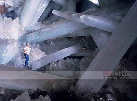 這些巨大的水晶長達11米,重達55噸,這些巨大的漂亮的水晶都是天然形成該洞位於墨西哥奇瓦瓦沙漠地下深處,洞深達1000英尺,洞內到處都是壯觀的發光巨型石柱,有松樹那麼高,全部為半透明的金色和銀色。晶體的形狀令人驚歎叫絕。晶體形成於含有硫酸鈣的地下水。由於地下一英里處是岩漿,在岩漿的不斷加熱下,含有硫酸鈣的地下水從數百萬年前就開始滲透整個洞穴,從而形成水晶洞。西班牙格拉那達大學的加西亞-魯伊斯說:「這真是自然奇觀啊!」接近籃球場大小。2000年發現的這個巨型水晶洞是一個寬10米長30米的馬蹄形石灰岩溶洞。巨大的水晶柱從洞穴的上面和四周突出來。加西亞-魯伊斯說:「世界上沒有哪個地方的礦物世界能有如此的漂亮了。」巨型水晶還將繼續生長。加西亞-魯伊斯估計在奈加山脈的其他地方可能還有這種巨型水晶存在。他說:「洞穴裡面要含有巨型水晶,它就必須坐落在一個溫度能夠保持在接近58攝氏度但又不高於這個溫度的深度的地方。」現在人們能夠進入這個水晶洞觀看那裡的巨型水晶是因為礦業公司用抽水泵將裡面的水抽走了,如果停止抽水,那麼水晶洞又會被水淹沒,那裡的水晶又會繼續生長。