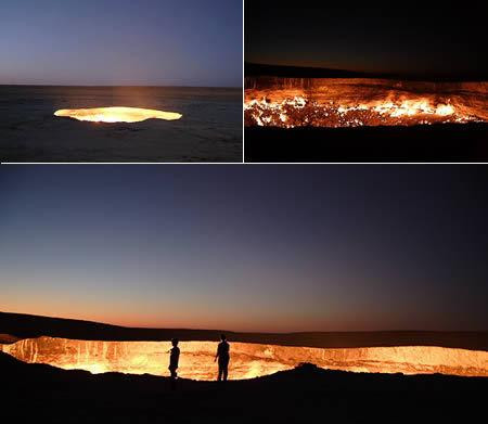 地獄之門位於烏茲別克斯坦達瓦茲附近。35年前地質學家鑽探天然氣時,意外發現一個巨大的地下洞穴,當時所有的鑽井現場設備和營帳都落了下去。沒有人敢下去,因為那裡的洞穴中都充滿了氣體,他們只好把它點燃,阻止有毒氣體洩漏出來。從那以後,洞內的天然氣不間斷地燃燒。沒有人知道這些年來有多少寶貴的天然氣被白白燒掉。