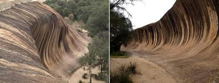 澳大利亞西部的波浪巖是天然岩層。由於它像高高的海浪因而得名。露出地面的部分佔地幾公頃,「浪潮」的部分岩石高約15米,長約110米。照片中顯示的是罕見岩石牆。